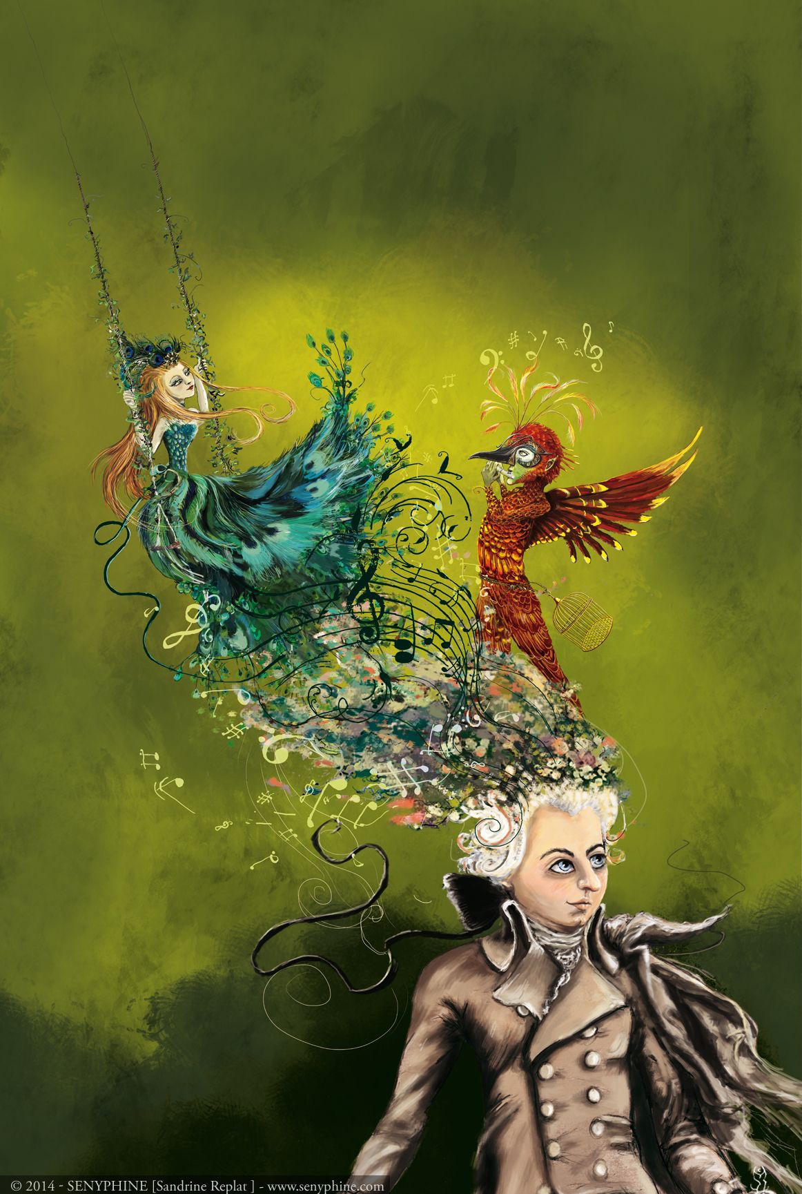 Poster designed for the musical play Mozart l'Enchanteur. Produced by Le Théâtre de l’Étreinte and performed at the Avignon festival and Paris's theaters.  Written by Charlotte Escamez. Staging by William Mesguich.