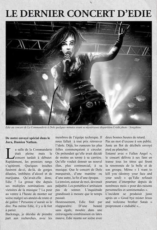 Legendary underground Gothic rockstar, Edie denied her origins by giving into the sirens of the glory. That is at least what some fans from the early days thought about her. They did not tolerate the multiple nominations to Les Victoires de la Musique Awards. Edie was almost inclined to think the same thing too until the day an admirer gave her a book of spell that was going to open up unexpected perspectives to her. At the end of a great concert in Dole, she mysteriously vanished away, leaving an audience going wild and under a supernatural, malevolent force. The morning after, the audience forgot what happened during that strange night...