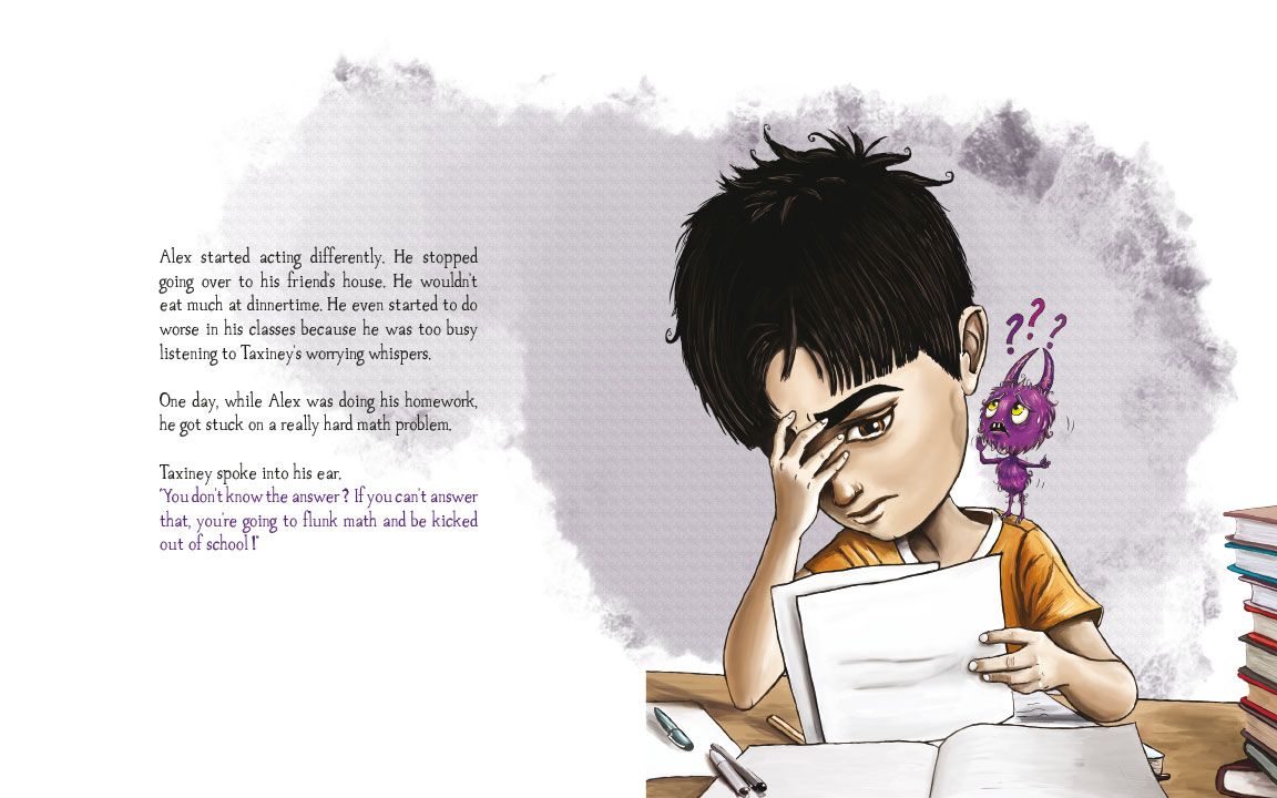 Résumé : Alex était un enfant comme les autres, à l'exception du petit monstre qui le suivait partout et qui lui chuchotait ses inquiétudes à l'oreille. Alex essayait de ne pas écouter le Monstre de l'Inquiétude mais au bout d'un moment cela devint difficile de l'ignorer. Les inquiétudes d'Alex grandissaient jours après jours, puis il se mit à chercher des réponses à ses questions pour ne plus être inquiet et il finit même par découvrir qu'il avait le pouvoir de les maitriser. Bien que ce livre ait été écrit pour les enfants, le message s'adresse à tout le monde. Il est important pour chacun non seulement de comprendre ce qu'est réellement l'anxiété mais surtout comment apprendre à vivre avec elle.