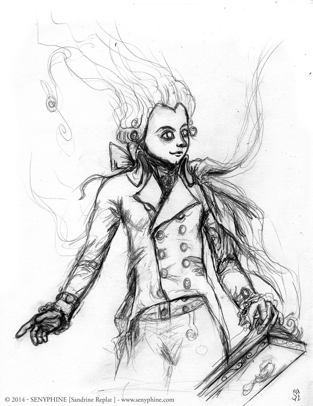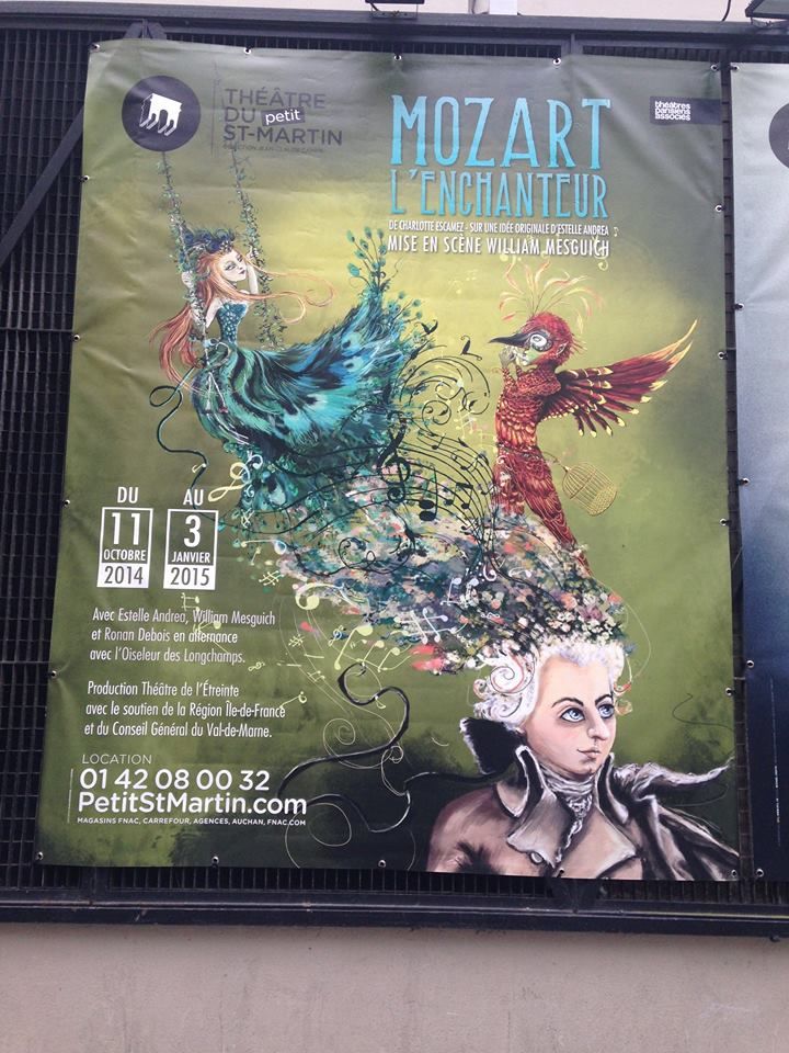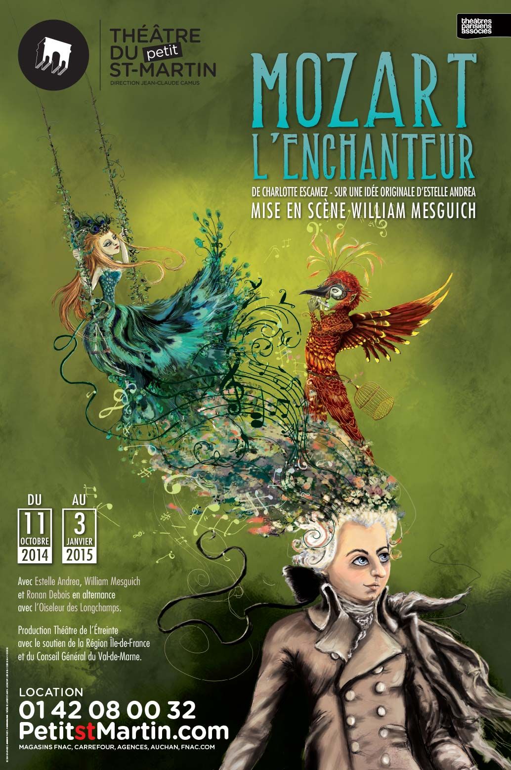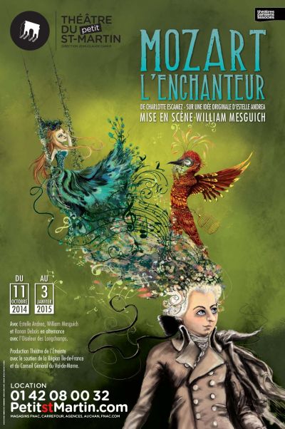 Poster designed for the musical play Mozart l'Enchanteur. Produced by Le Théâtre de l’Étreinte and performed at the Avignon festival and Paris's theaters.  Written by Charlotte Escamez. Staging by William Mesguich.